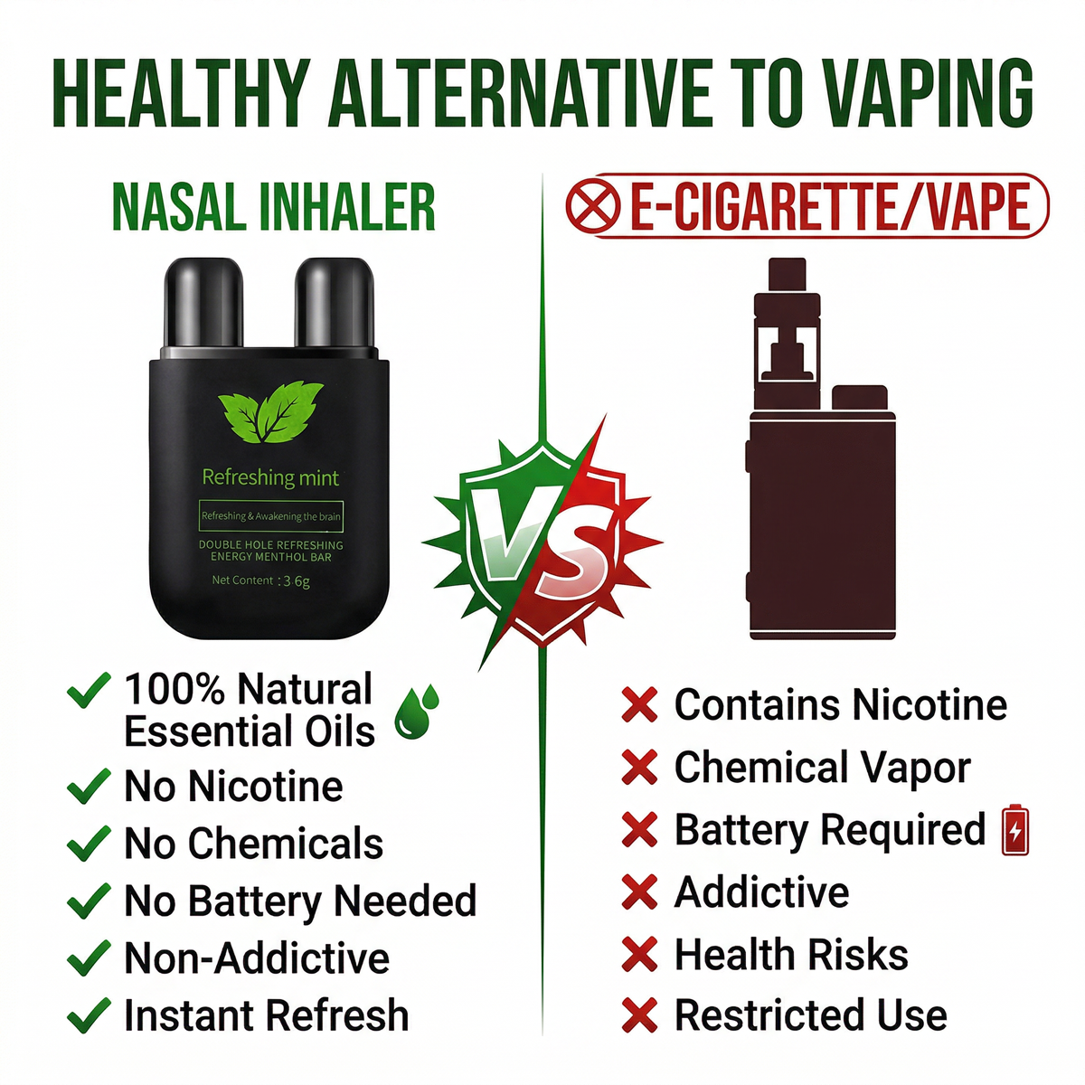Traditional single‑hole inhalers force air through one nostril, leaving the other side underutilized. Our dual‑channel design balances airflow across both nasal passages, creating: