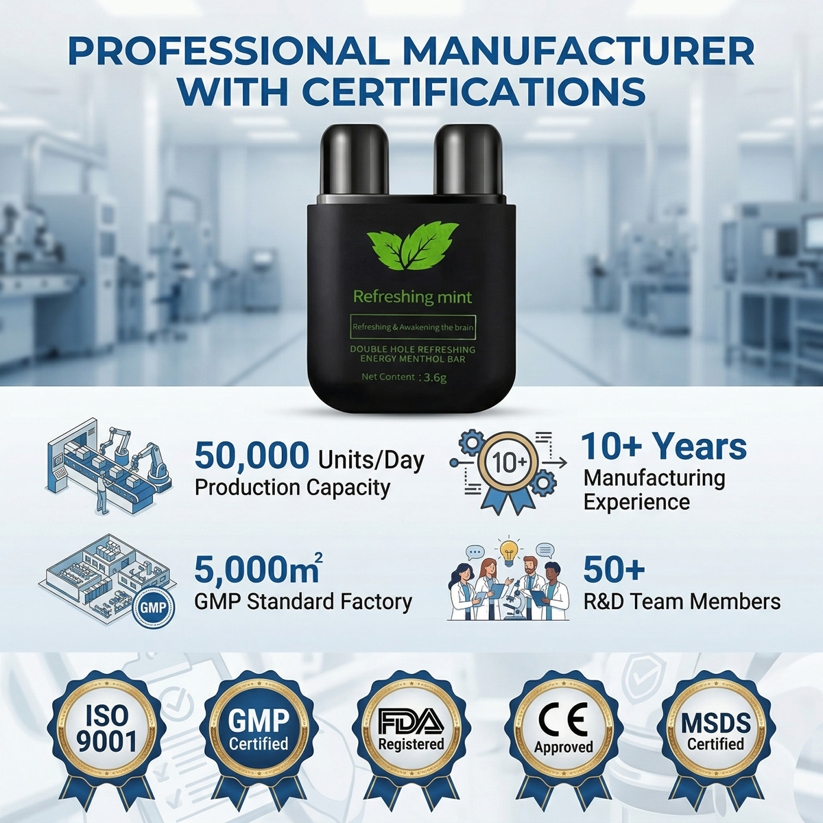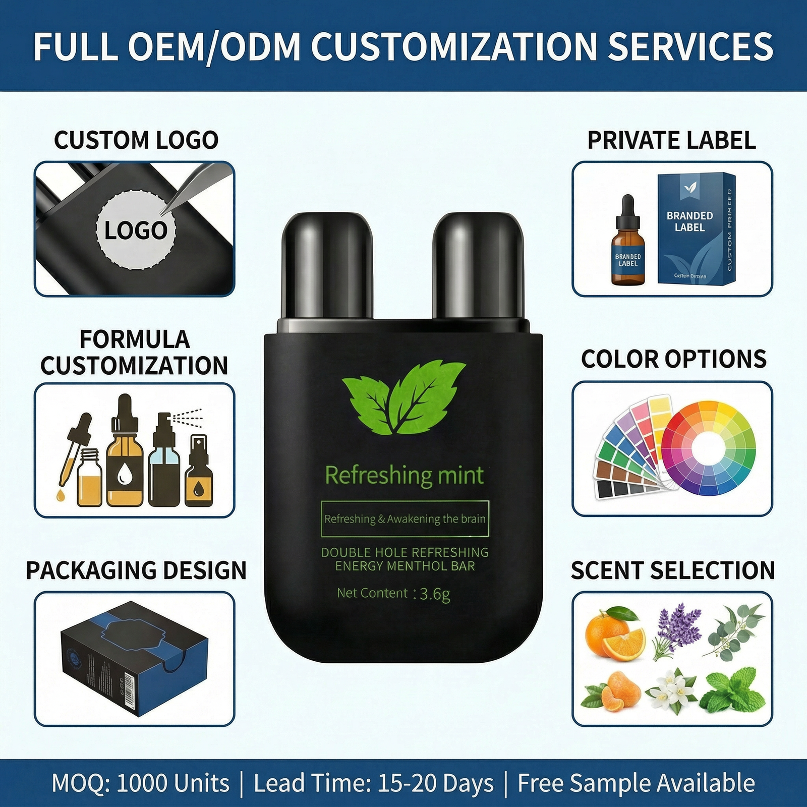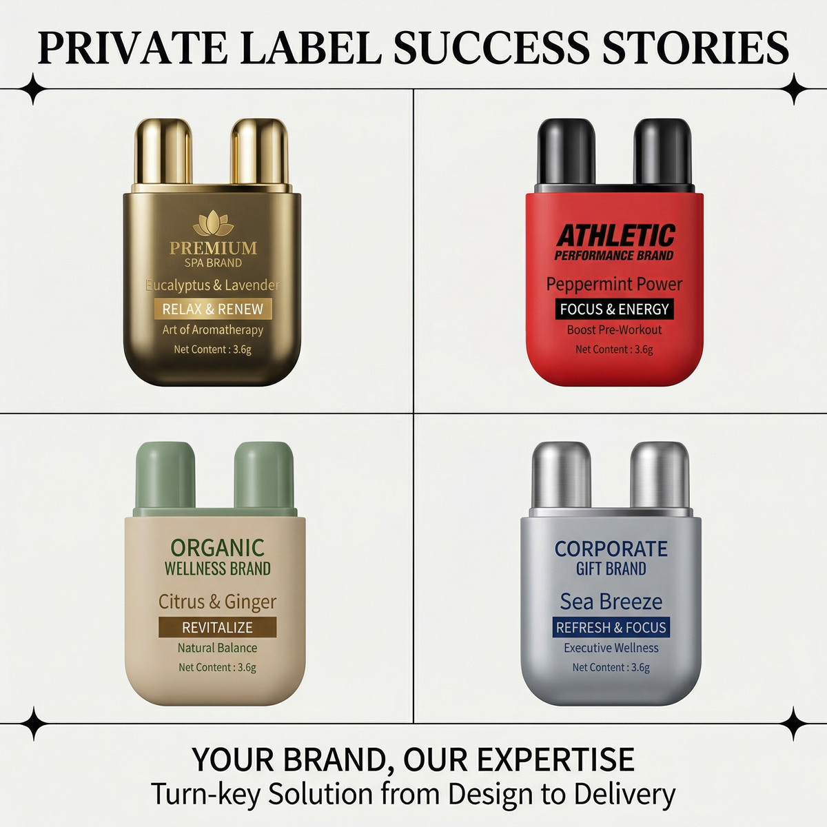 Challenge: A new brand wanted to launch a double hole nasal inhaler focused on allergy relief. They needed low MOQ and custom eucalyptus‑peppermint blend.