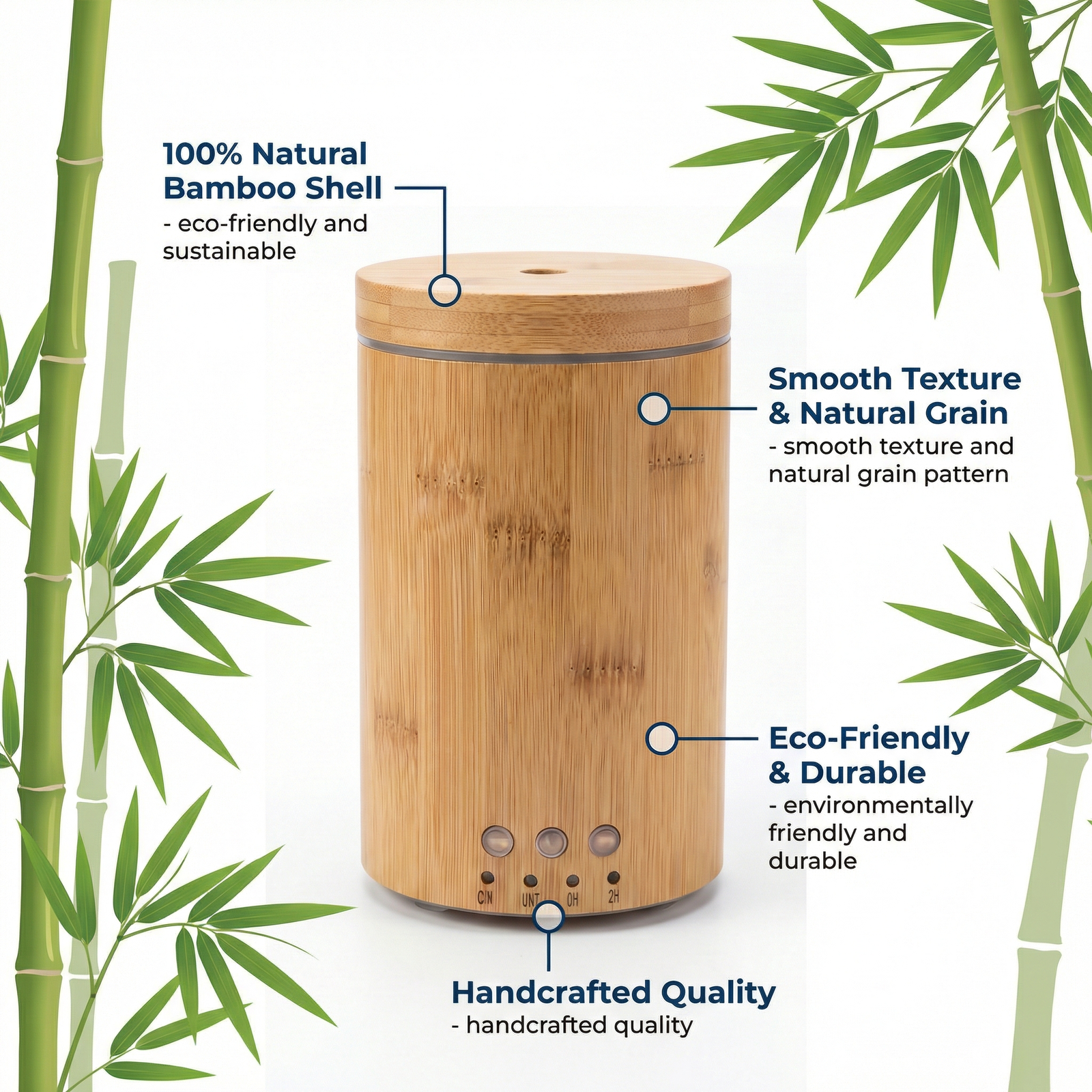 • Authentic Material Integrity: We do not use veneers or wrapped plastics. We use real, sustainably harvested bamboo. Each grain is unique, ensuring no two diffusers are exactly alike—giving your products a premium, organic feel.